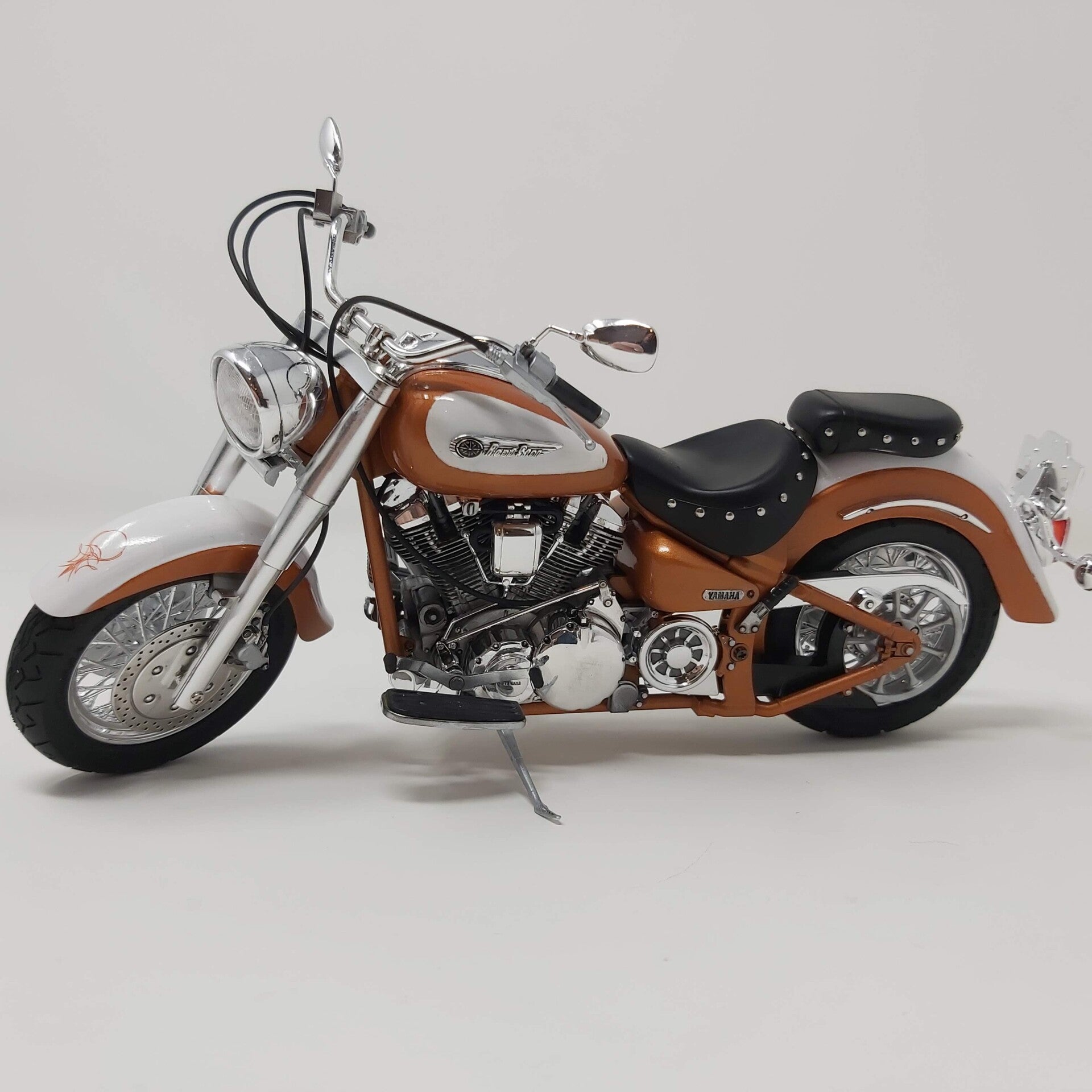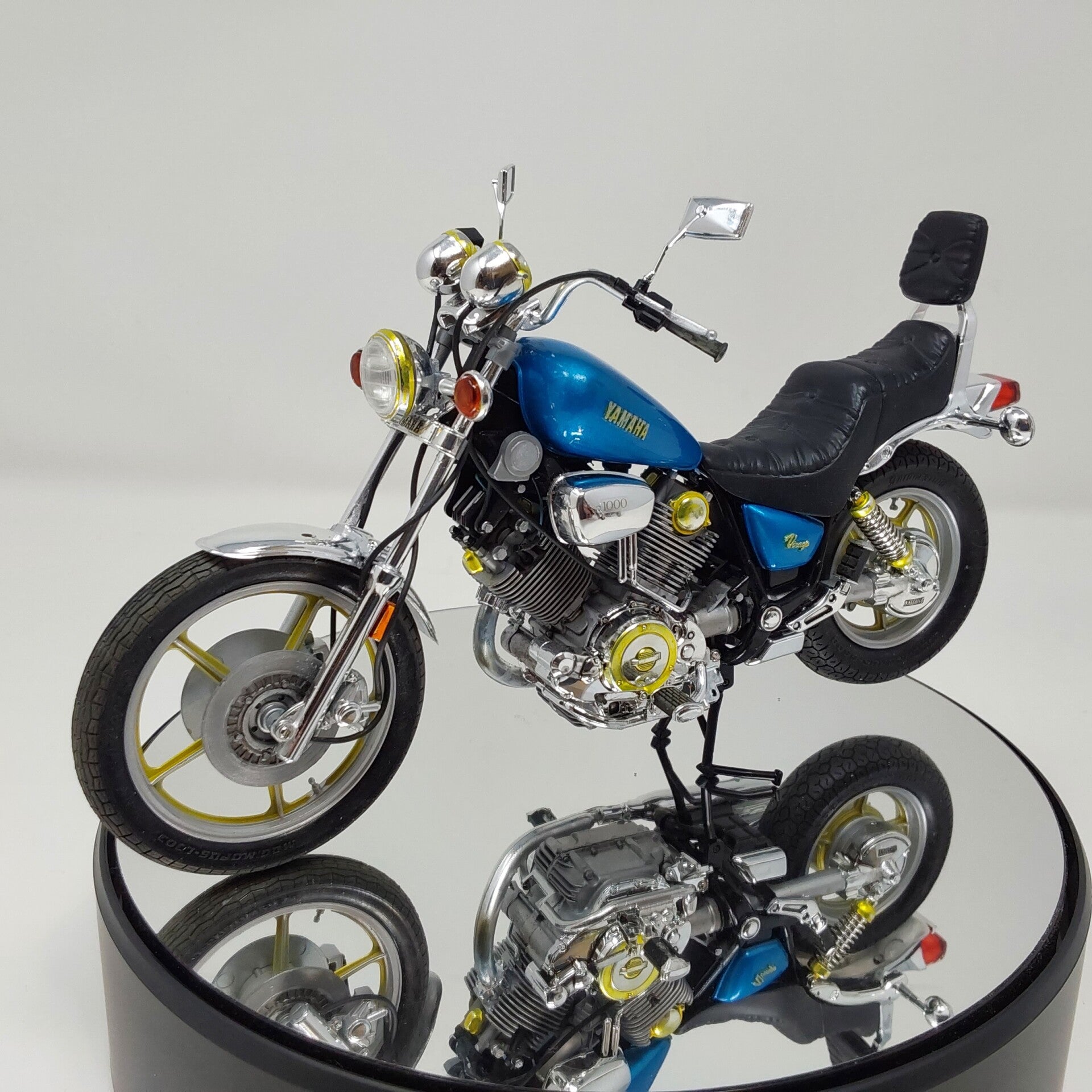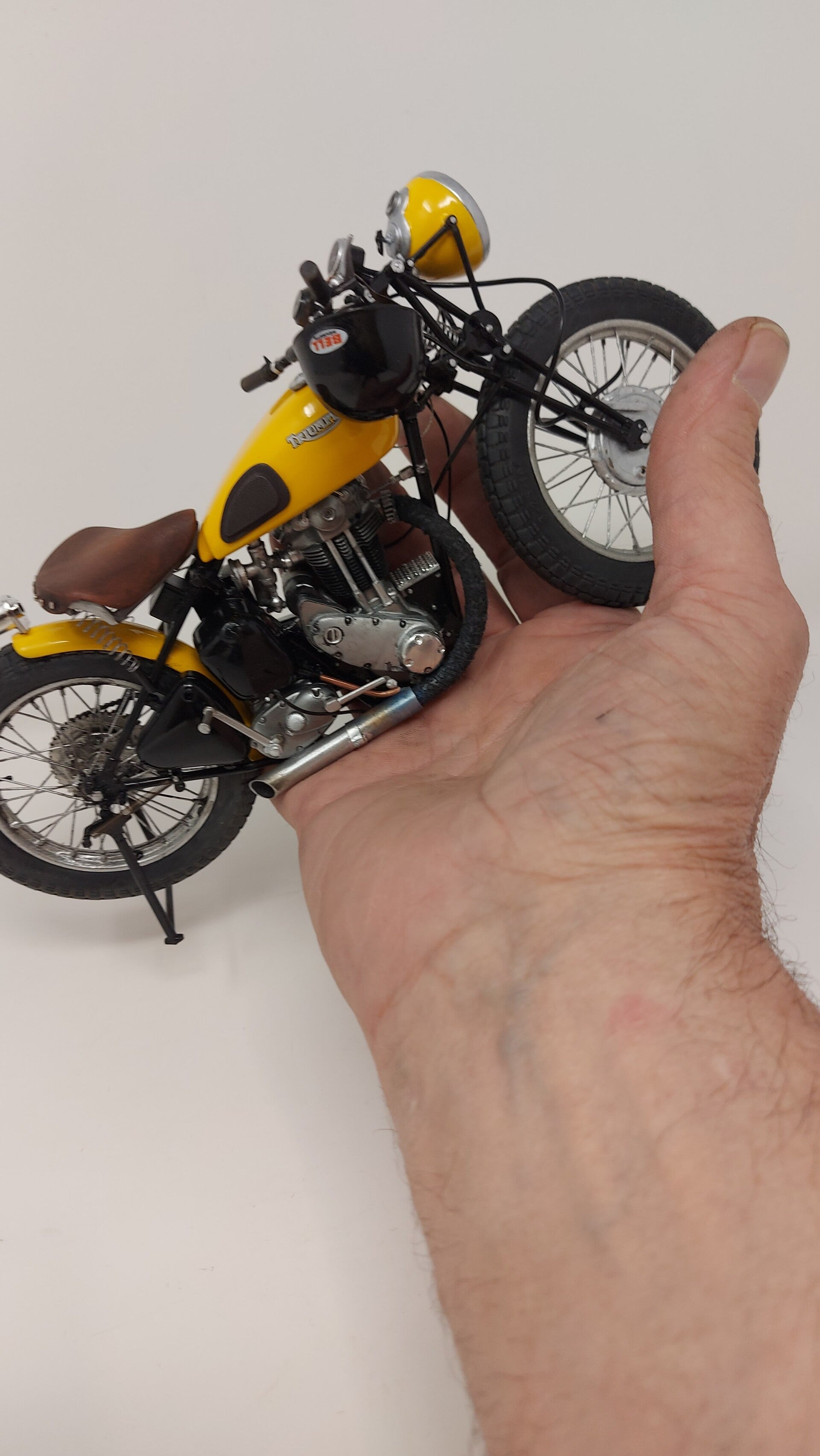 Motorcycle models are 1/16 scale with the exception of the yellow Triumph at 1/12 scale and the yellow Harley. Many are chopped and customized